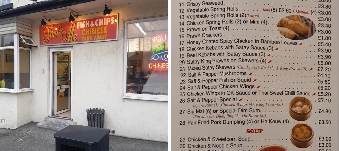 You & Me specializes in Chinese takeaway and dining options, featuring a diverse menu that includes starters, soups, curries, and even fish and chips.